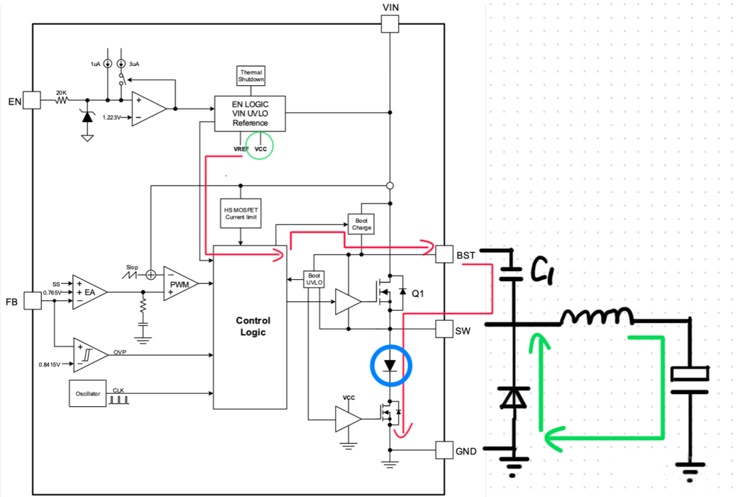 異步DCDC中的自舉電容介紹下面,我們通過(guò)一幅圖來(lái)看一下,對(duì)于異步 DCDC 芯片,它的自舉電容的充電回路是怎么樣的,因?yàn)楫惒?DCDC 沒有